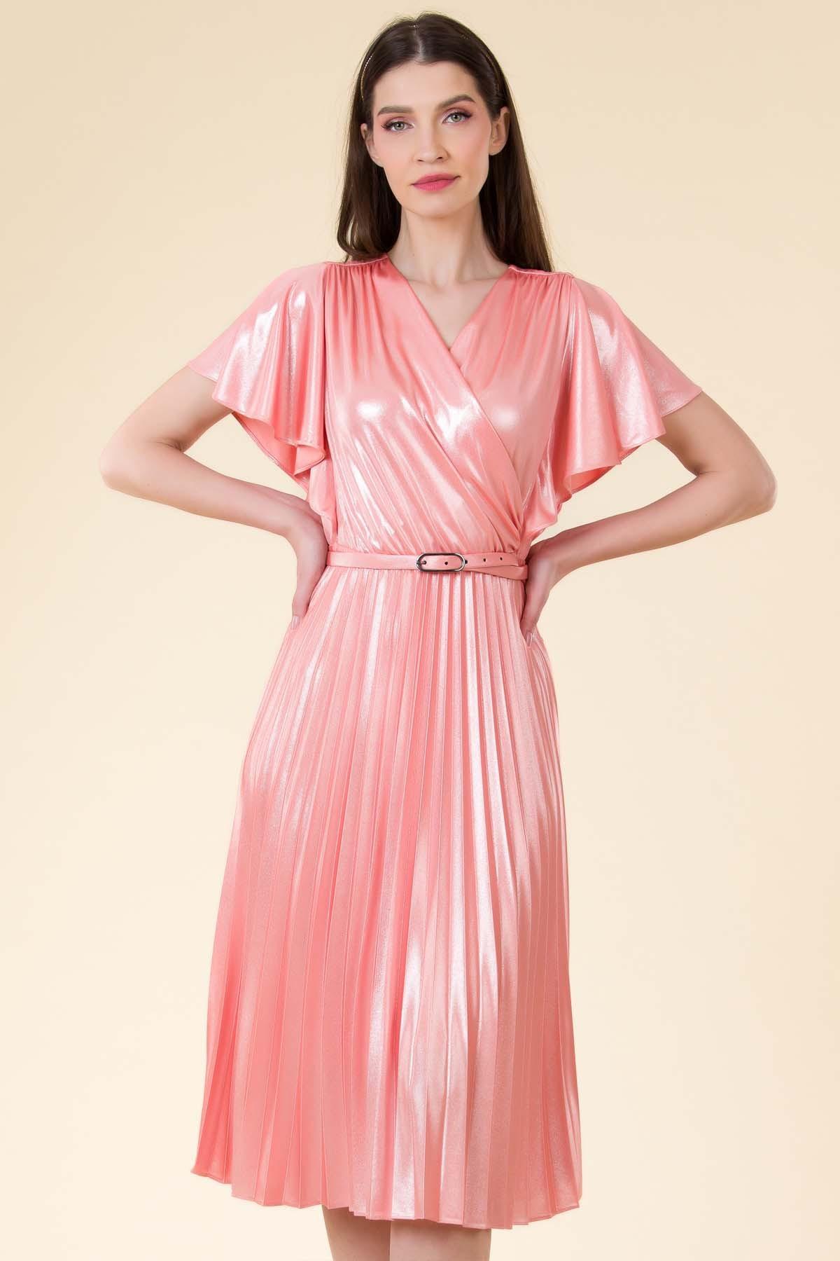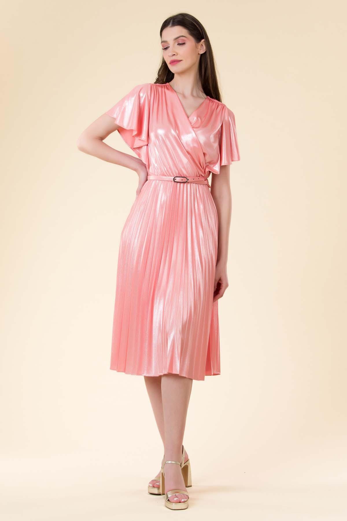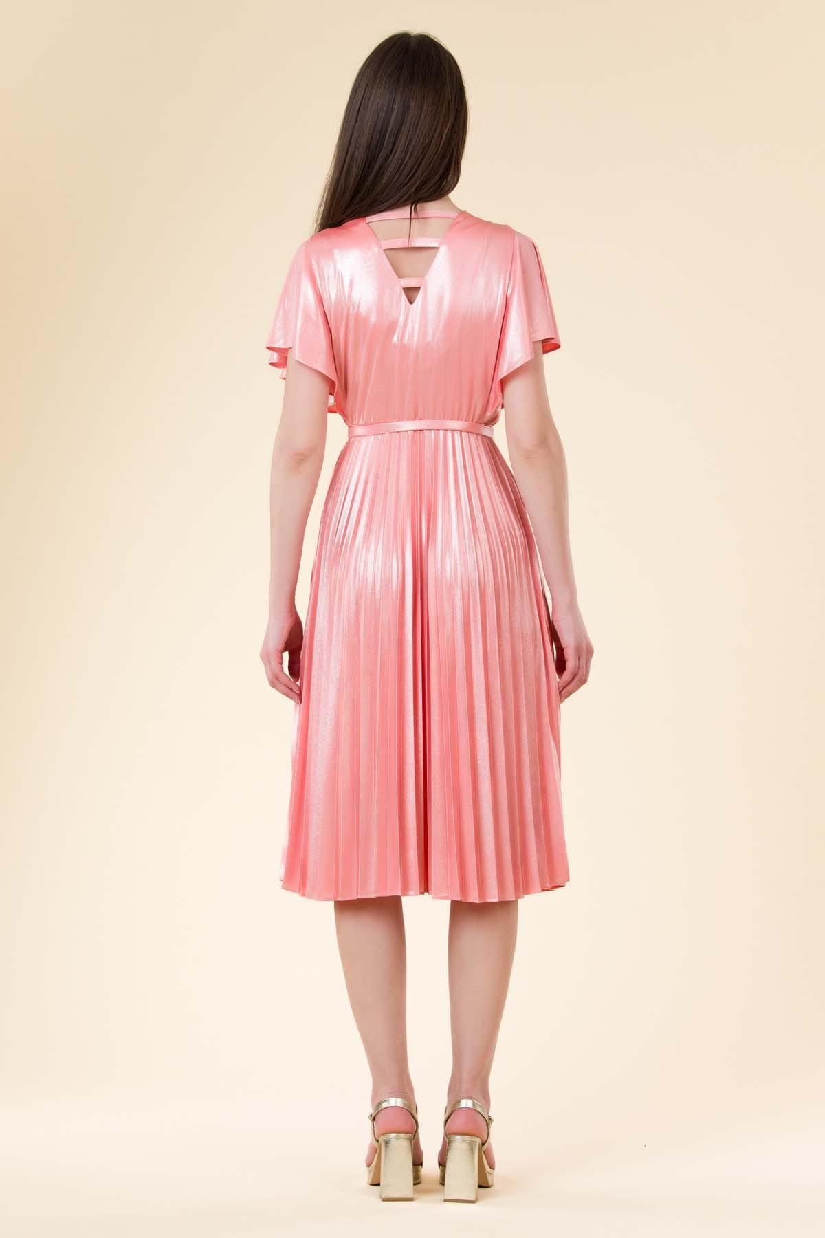 Stella dress made of film-coated material, chic cut with V-neckline, pleated skirt, butterfly sleeve and barrettes in the back neckline.