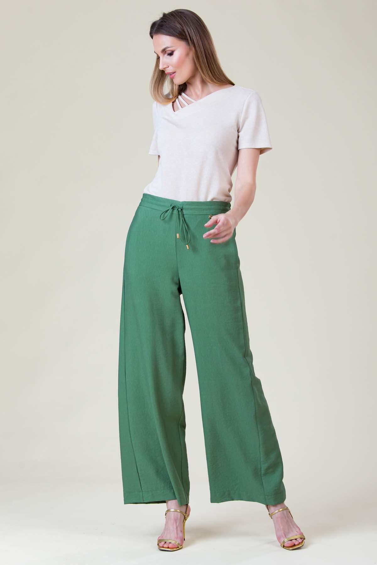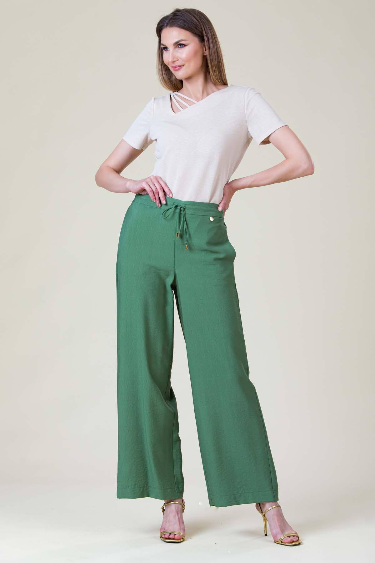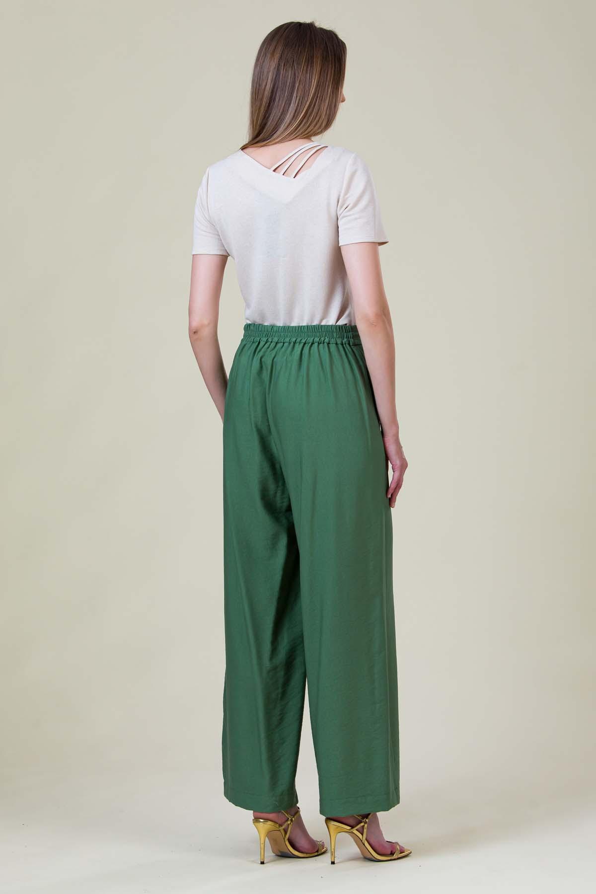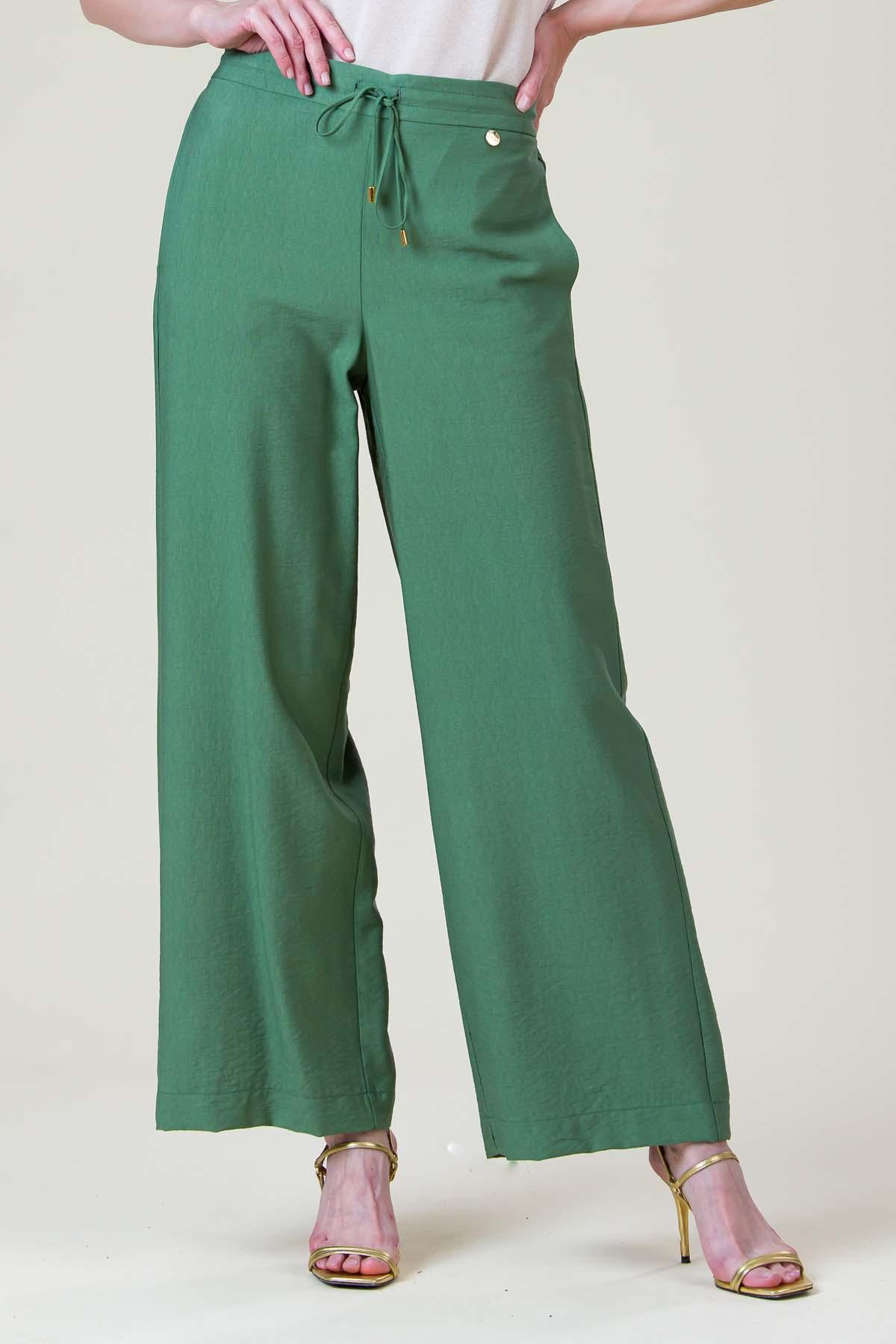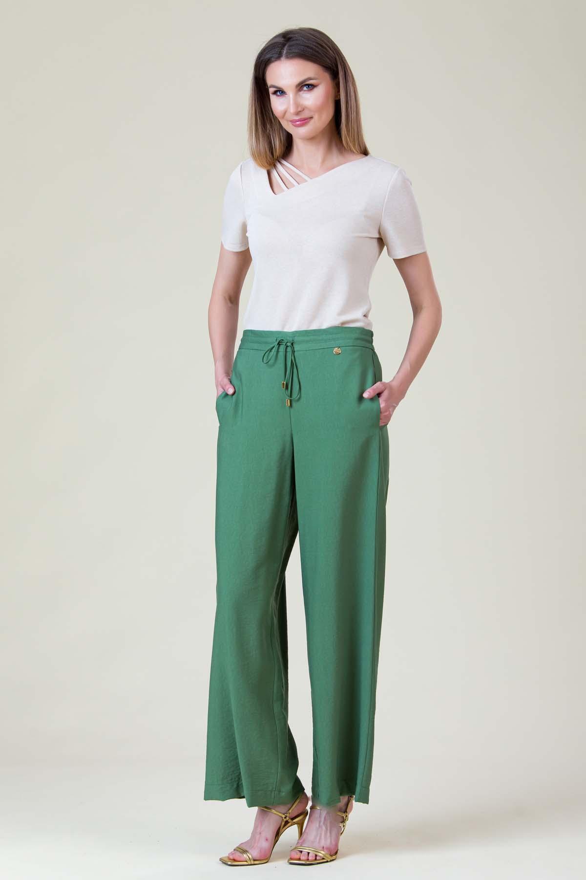 Pantaloni Jenny din viscoza creponata cu buzunare laterale si croiala lejera. Talia se regleaza cu elastic la spate si snur cu opritori metalici.