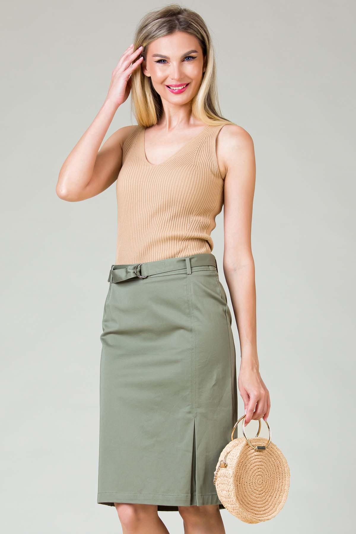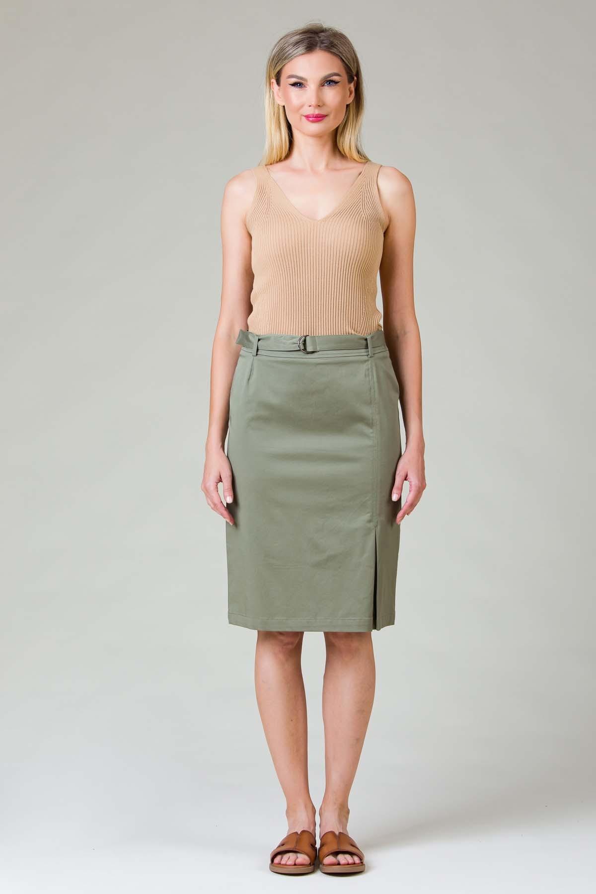 Fusta Amna din bumbac stretch cu slit in fata si cordon cu accesoriu metalic in talie.