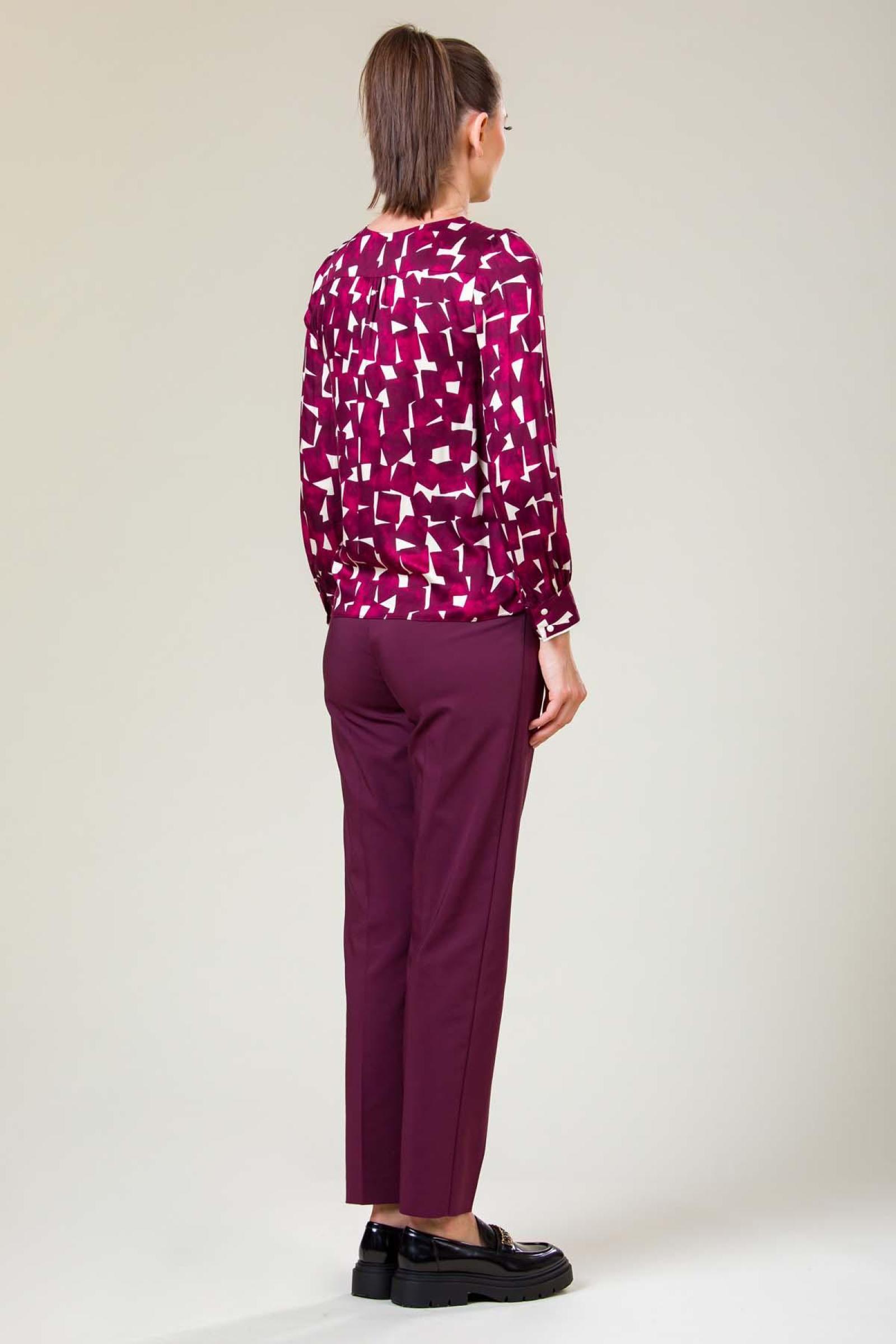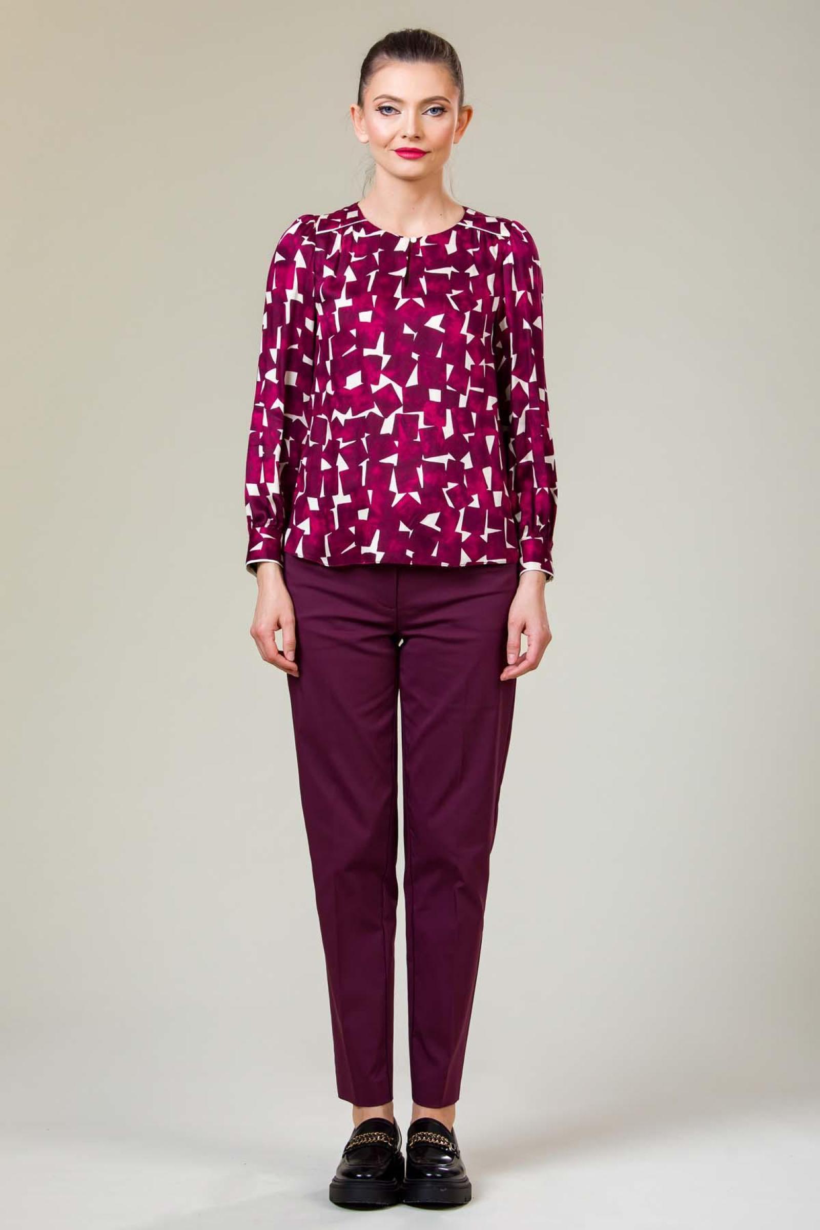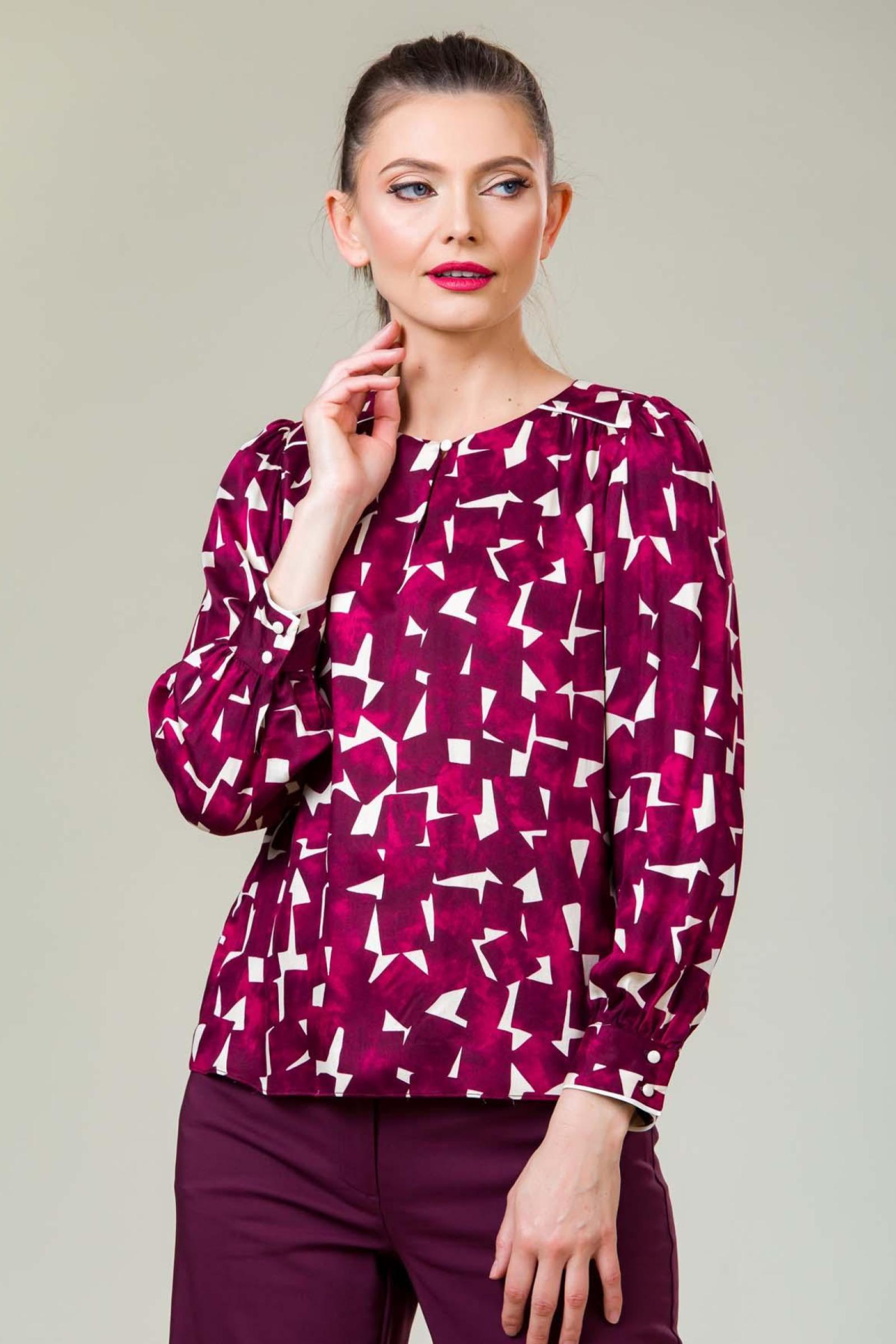 Bluza Celine din viscoza imprimata calitate premium, piping contrast la mansete si platca fata si maneci cu incretire fina.