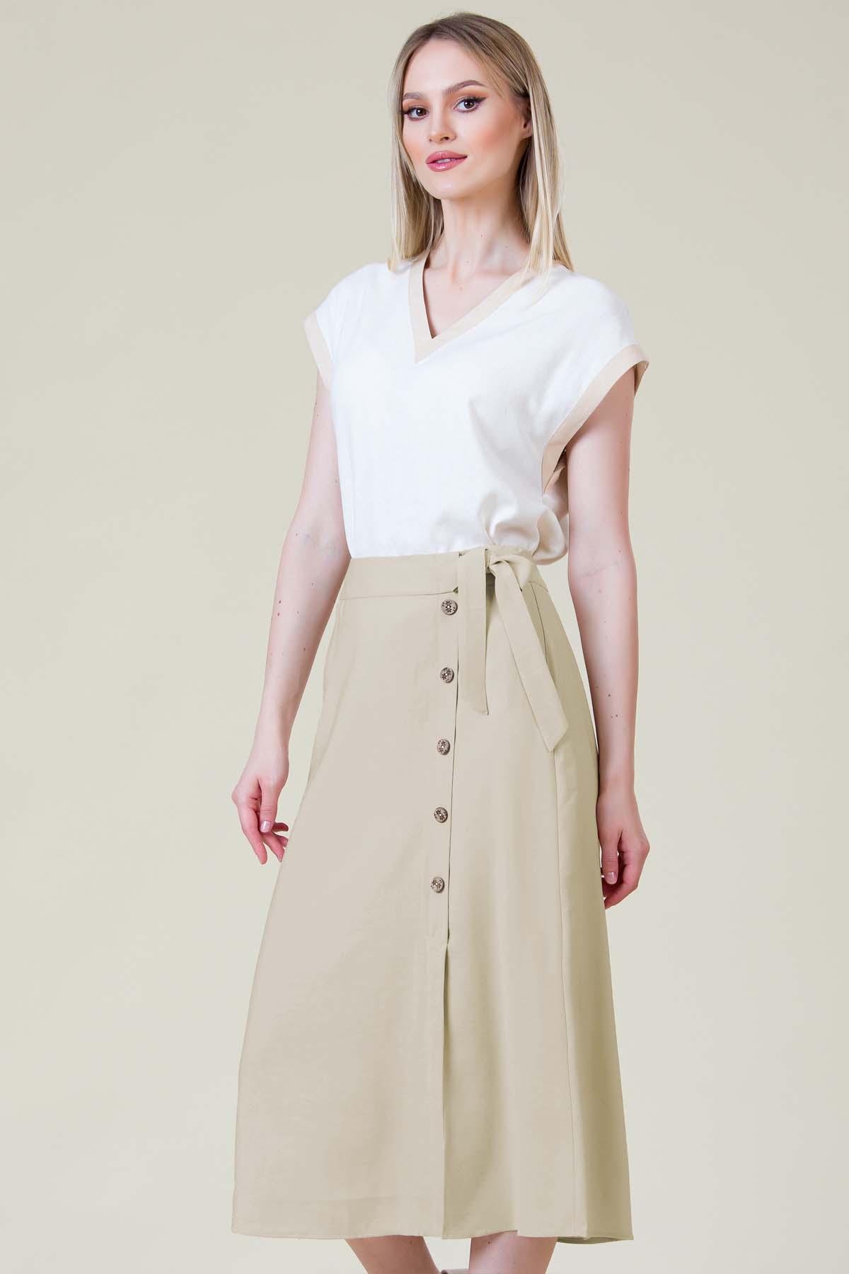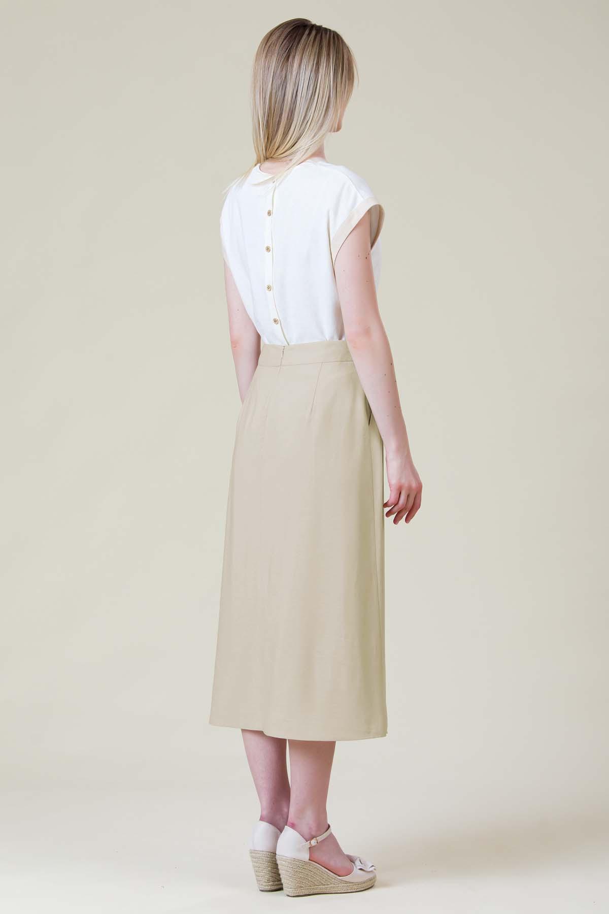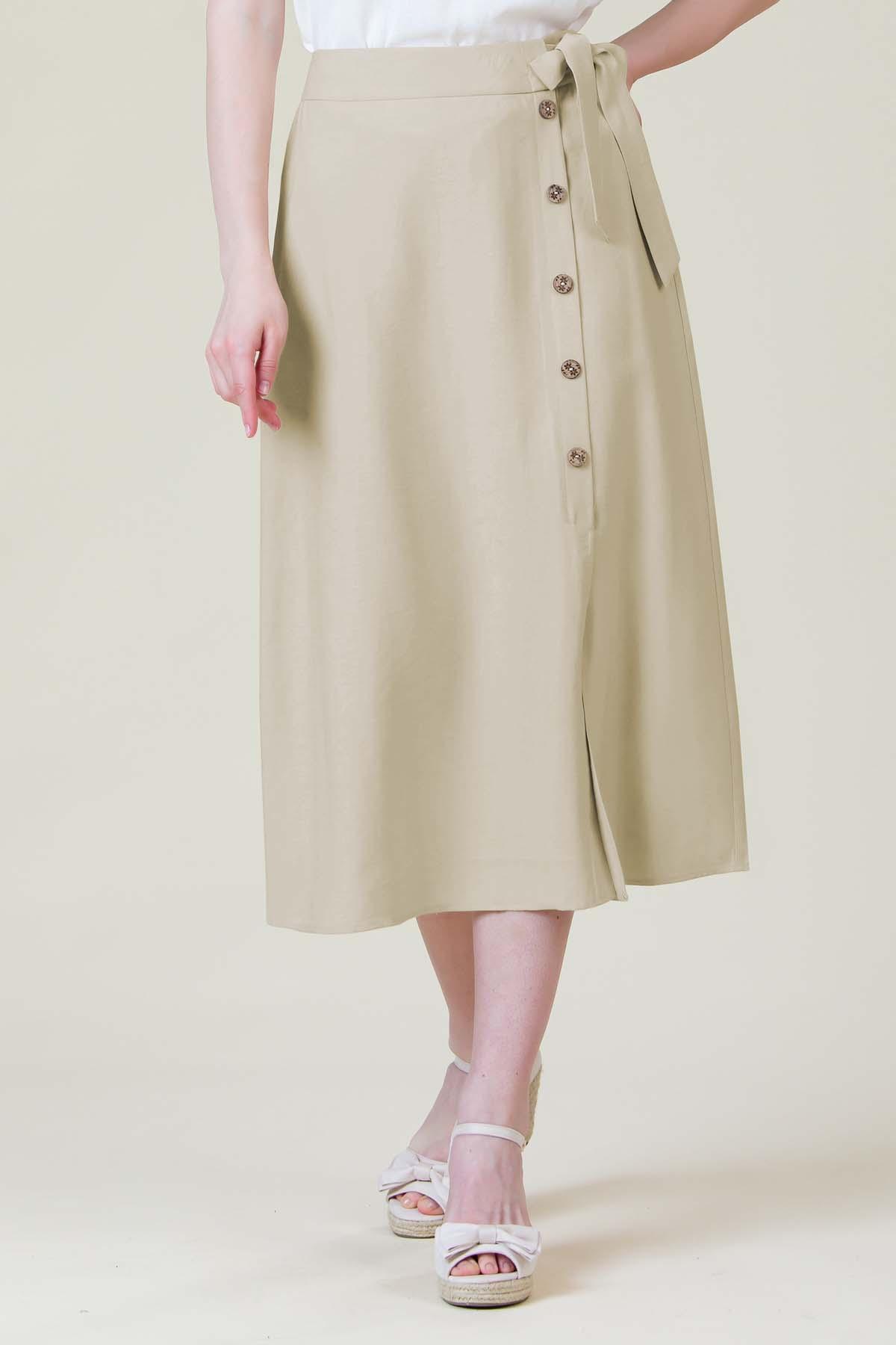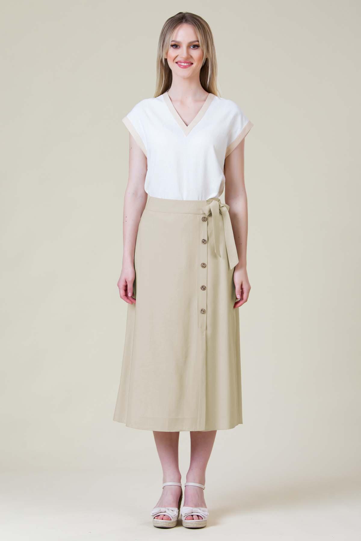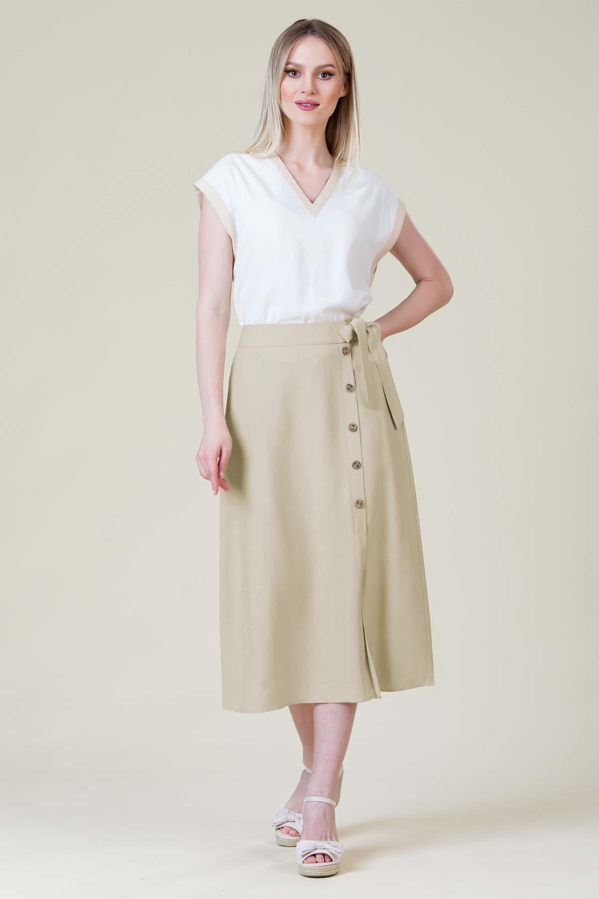 Fusta Cosmina din viscoza creponata, nasturi din cocos pe lateral, inchidere cu fermoar si ajustare in talie cu cordon.