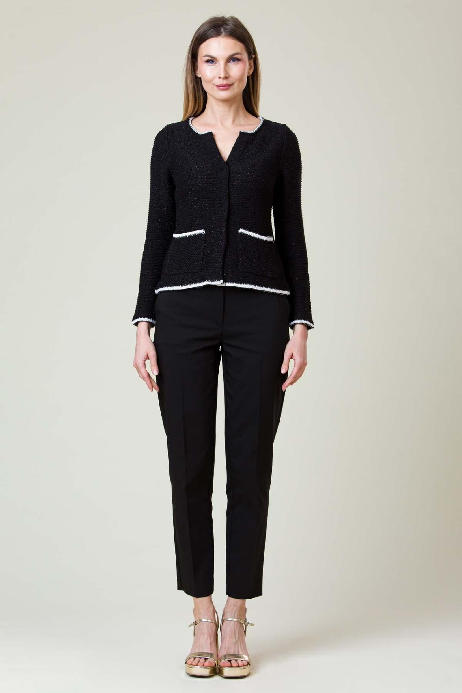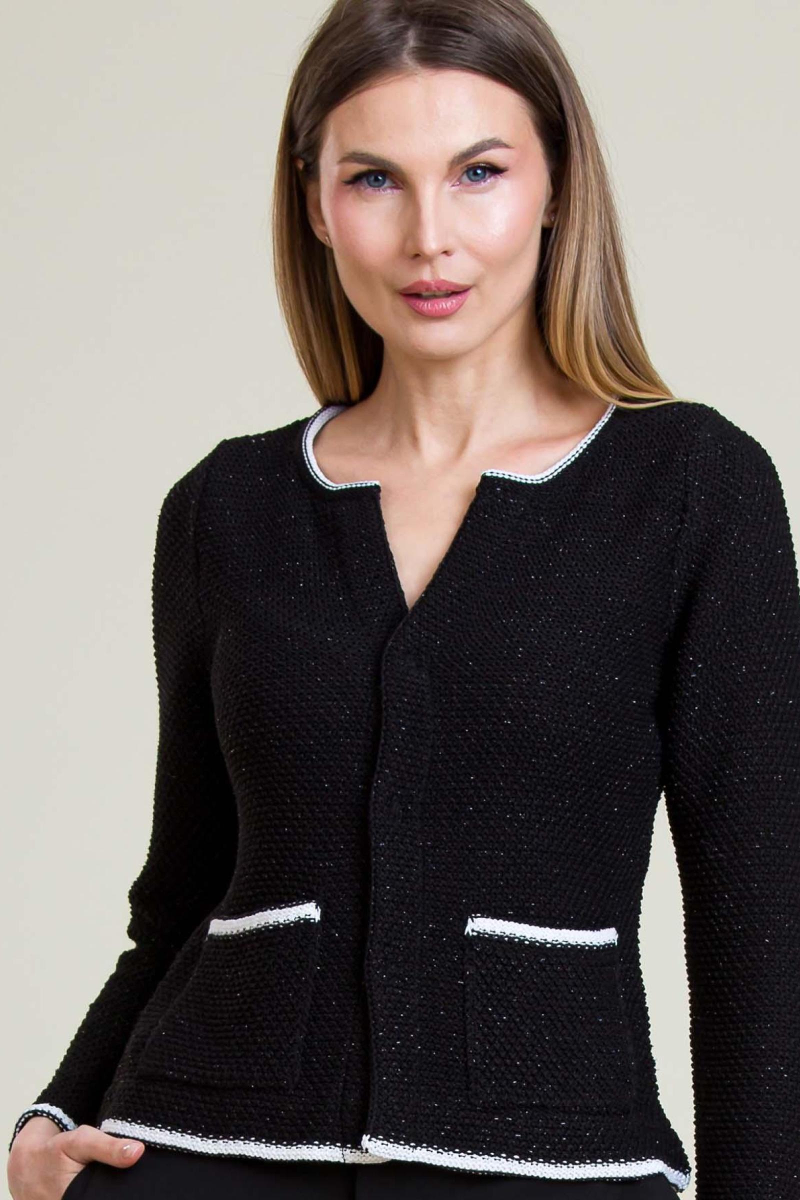 Jacheta tricotata Vivian din fir cu bumbac, croi tip Chanel cu detalii contrast la buzunare si terminatii. Modelul din imagine poarta marimea S si are 177 cm.